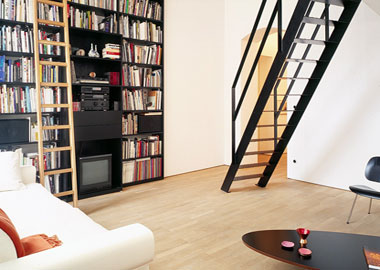Programm Um- & Ausbau zu Atelier- & Wohnraum Ort Berlin Klient Privat Leistung LPH 1-9 Jahr 1995 Projektteam K. Schemel, G. Langer Material Eiche, Edelstahl, Marmor Nutzfläche 160 m2