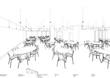 Auf einem ausgedehnten Firmengelände der frühen 70er Jahre befand sich in einem Flachbauappendix eine unattraktive Kantine. Gast- und Küchenraum waren nur mit Oberlichtbändern ausgestattet, also introvertiert, dunkel und kaum belüftet. Das Budget war sparsam, die Wünsche an den Raum einfach und wesentlich: Licht, Luft, Sonne und eine innenarchitektonische Atmosphäre, die mit Understatement modern und für Werksangehörige wie Geschäftsführung gleichermaßen selbstverständlich erscheint. Unser Eingriff arbeitet mit der konstruktiven Tektonik des Gebäudes. Den schachtelartigen Gastraum haben wir an zwei Wandseiten vollständig geöffnet und zwei Terrassen/Extensionen als Sichtbetonplateaus vorgelagert, die wie um 90° auf den Boden umgeklappte Wandtafeln wirken. Die Verglasungen eröffnen zwei bildartige Ausblicke auf Landschaft und Garten. Der vergrößerte Raum wird durch einfachste Eingriffe homogenisiert : - geschliffener, gewachster Estrich auf dem Boden, - hellblaue, mit XXL-Firmensignatur versehene Colorierung auf den Wänden, - weiße Colorierung der Decke, - Edelstahlausführung aller Servicebereich; und durch Mobiliar programmiert: - einem Programmteppich aus inselartigen Jacobsen-Tischgruppen, Nussbaum furniert, der sich im Sommer nach außen auf die Terrassen ausdehnt, - einem schwebenden "Lichtteppich" aus Globe-Lampen, - hellblauen Filzvorhängen, die bestimmte Inselsituationen im weichen Programmuster visuell abschirmen und bei Bedarf eine temporäre Grenze generieren.