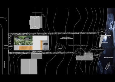 An einem beinahe unangetasteten Ort haben wir versucht, unsere Architektur nur als Ermöglicher von Natur- und Landschaftswahrnehmung zu begreifen – und die Innenräume so zu verorten und zu adressieren, dass sie differenzierte Natur-Bilder und Lichteinfälle liefern. Die Setzung von drei Hauskörpern zoniert das langgestreckte Grundstück in einen vorderen Bereich mit Parkplatz und einem kultivierten Hortus Conclusus gen Süden und einem dem See zugewandten leicht topographischen landschaftlichen Bereich gen Norden. Sobald man das Grundstück betritt oder befährt befindet man sich „im Garten“ und flankiert einen Teil desselben, um zu den Eingängen der eingeschossigen Gäste-/Einliegerwohnung und des Hauses zu gelangen. Deren Sichtbeziehungen in Garten und Landschaft bleiben jeweils ungestört und autonom. Der quergelegte Hauskörper beinhaltet einen großen, sonnenlichtdurchlässigen, zum Teil hallenartigen Wohn-Lebensraum mit Feuerstelle, der sich komplett zum See hin öffnet. Auf oberer Ebene befinden sich Bibliothek und Arbeitsgalerie zur Seeseite, welche wiederum flankiert wird durch einen gen See hin auskragenden 3. Hausteil, den Schlafbereich mit Nebenräumen. Eine große Terrasse als Fortsetzung des Wohnraumes im EG vermittelt in die fast Natur belassene Landschaft hinein, eine angedeutete Treppe mit Landschaftsstufen führt zum kleinen Bootssteg, zum See und zum Horizont hinab.