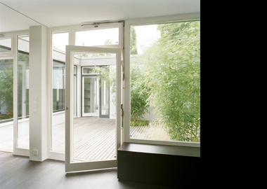 Die eingeschossige Teppichbebauung (Arch. J. Krahn 1957) im Interbauviertel arbeitet mit der Typologie des urbanen Atriumhauses und dessen spez. Raumqualitäten von Offenheit und Umschließung. Unser Eingriff modifiziert die vorh. kleinteilige Raumstruktur zugunsten eines großzügigeren Maßstabs und versucht, die vorh. Raumqualitäten von Durchdringung innen-außen, offener Grundrissgestaltung, Flexibilität der Räume zu intensivieren. Die maßgebliche Innovation liegt in der programmatischen Widmung und Zuordnung der Außenräume, die als erweiterte „Zimmer“ begriffen werden. Die Böden des Hauses und der interne Garten werden schwellenlos mit einem dunklen glänzenden Holz-Teppich belegt, aus welchem im Innenraum Schrankobjekte erwachsen, im Außenraum Pflanzinseln ausgestanzt sind. Wände/Decken werden rückgebaut, geglättet und mit elfenbeinfarbenem Putz beschichtet bzw. mit wandgroßen Schiebepaneelen ausgestattet. Hoch installierte Bereiche, Bäder, Küche, Kamin werden mit mokkafarbenen Glasfliesen bzw. mit poliertem Schiefer ausgestattet. Die Intervention an den Fassaden respektiert in Grundzügen Maßstäblichkeit und Gliederung der 50er, an 3 Stellen wird diese jedoch durch den Einsatz liegender XXL-Glaselemente aufgebrochen. Eine Membran aus feinen Bambusjalousien dient der Verschattung und komplettiert mit papiernen Akaris ein fernöstlich inspiriertes kontemplatives Raumerlebnis für eine europäisch-asiatische Bauherrenschaft. Damit belässt der Umbau das Krahn-Haus außen in der Erscheinung der 50er Jahre und nutzt interkulturelle Anleihen der Moderne für eine zeitlose innere „Auskleidung“ der Räume und ein exklusives urbanes Wohnen mit privaten Gartenzimmern.