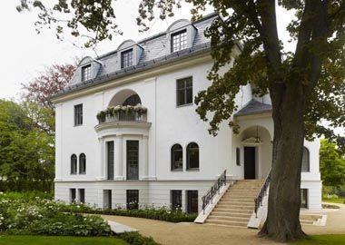 Die Villa befindet sich auf einem exklusiven weitläufigen Seegrundstück in unmittelbarer Nachbarschaft zu den bekannten Villen Urbig und Herpich, Truman und Stalin Villa. Das in der DDR-Zeit bunkerartig verbaute und „geschliffene“ Objekt mit Geländer und Säule am Haupteingang, Fragmente einer Zaunanlage und Kaminfassade als einzigen stilistischen Zeugen einer ehemals opulenten Vergangenheit, wurde komplett bis auf den stereotomischen Rohbau rückgebaut, durch weitere Durchbrüche in Wänden und Decken gravierender Interventionen in die Statik unterzogen. Da kein ursprüngliches Planmaterial und keine identifizierbare Urheberschaft vorhanden war, wurde in Bezug auf drei historische Photographien, eine historisierende Erscheinung der äußeren Gesamtkubatur entwickelt. Auf der Seeseite wurde die Kubatur erweitert durch einen klassischen säulengetragenen Altan mit großzügigem Balkon und durch eine vorgebaute Terrassenanlage mit weitläufigen Treppen in den parkartig angelegten Garten. Die innere Raumstruktur wurde in der Belle-Etage beinahe maximal entkernt, um eine repräsentative und fließende Wohnebene anzulegen. Zusammen mit der weitläufigen Terrasse und dem unbegrenzten Blick auf Garten, See und Landschaft wird besonders hier eine außerordentliche Großzügigkeit erlebbar. Verbinder und Protagonist der insgesamt vier Geschosse ist eine hölzerne skulpturale Treppe, die sich im Luftraum im Sinne einer „promenade architecturale“ frei faltet und phantastische vertikale Ein- und Aussichten ermöglicht. Die Materialien des komplexen Innnenausbaus, weiß-geölte Eiche, Wenge-lasierte Eiche, heller Travertin - und differenzierte warm-grey und weiß Lacktöne verleihen den Räumen eine subtile Eleganz.